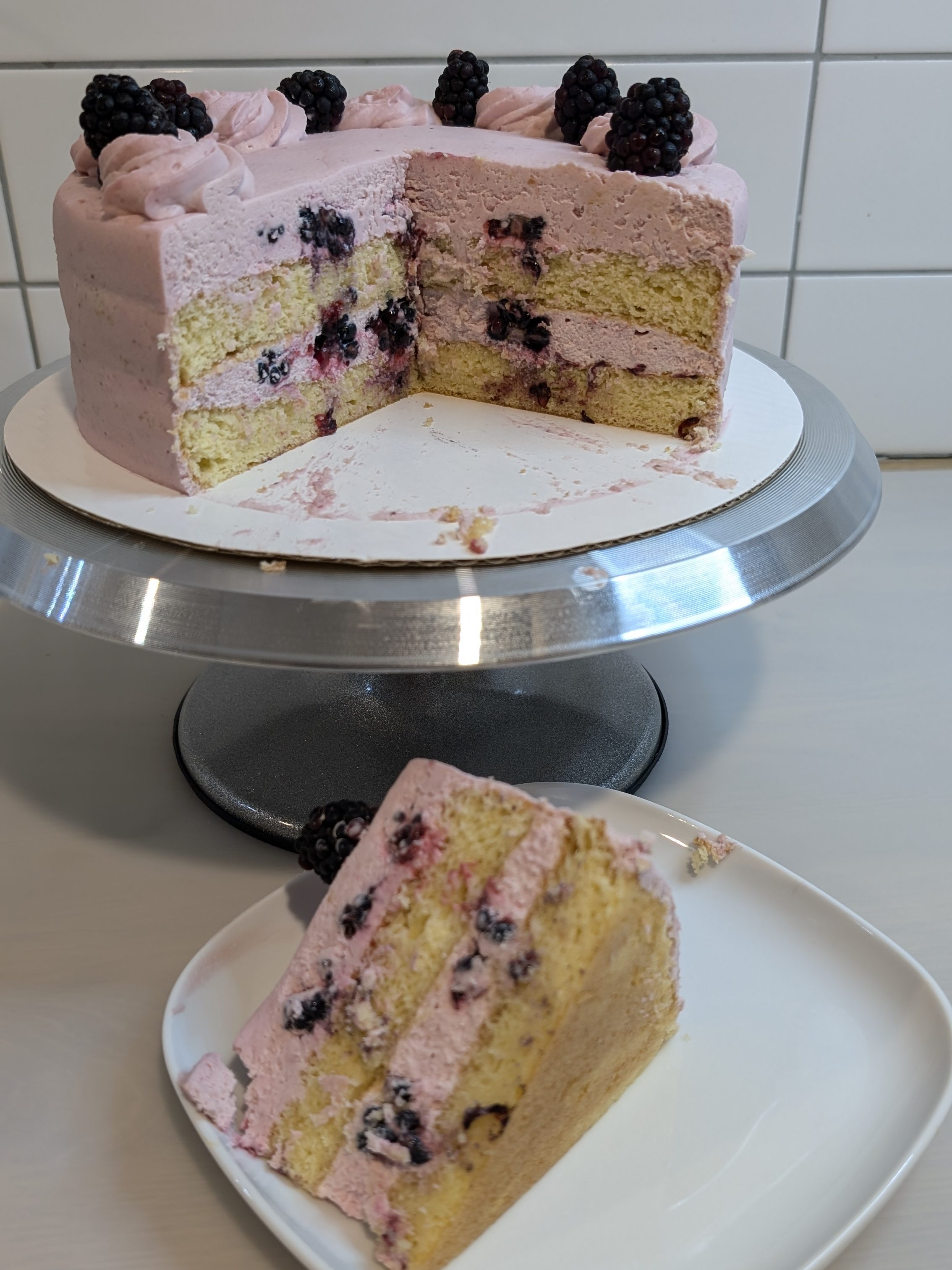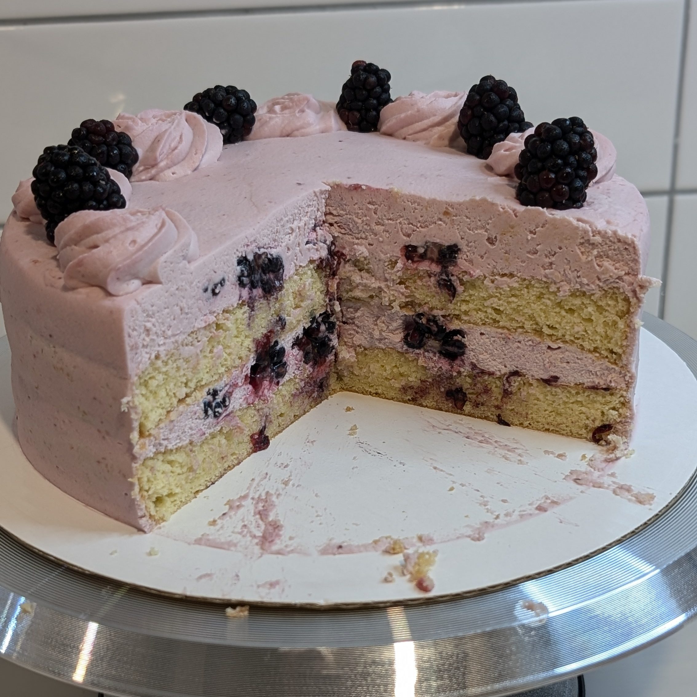 Pipe rosette on the cake and add fresh blackberries in between. Cool the cake in the fridge for at least 2 hours.