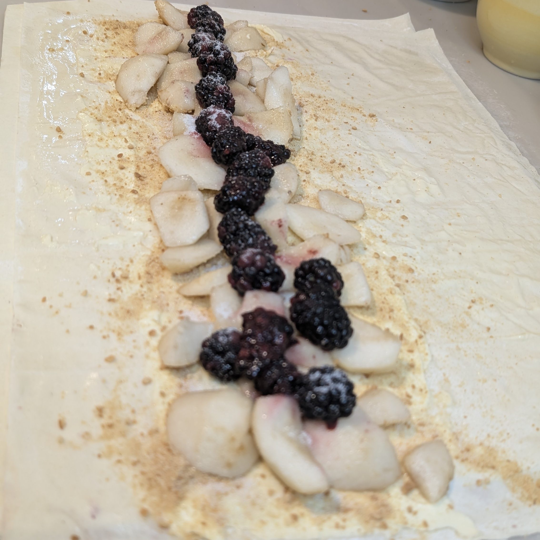 Sprinkle over cookie crumbs then add ⅕ pears and a ½ cup of blackberries in a central line (lengthways).