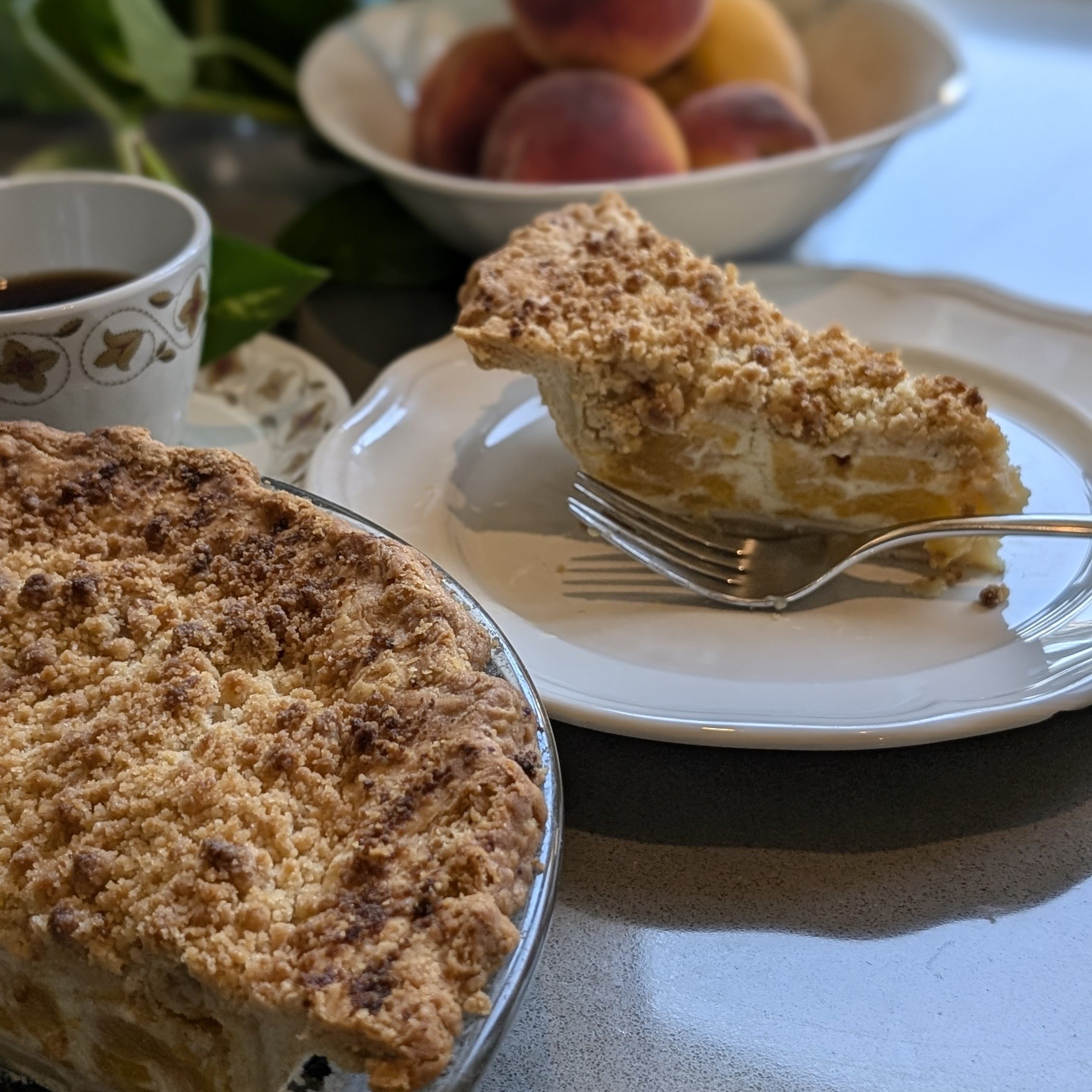 Carefully fold peaches into the mascarpone filling. Fill the unbaked pie shell. Top with streusel. Bake at 420 F for about 30 minutes until the filling is set.