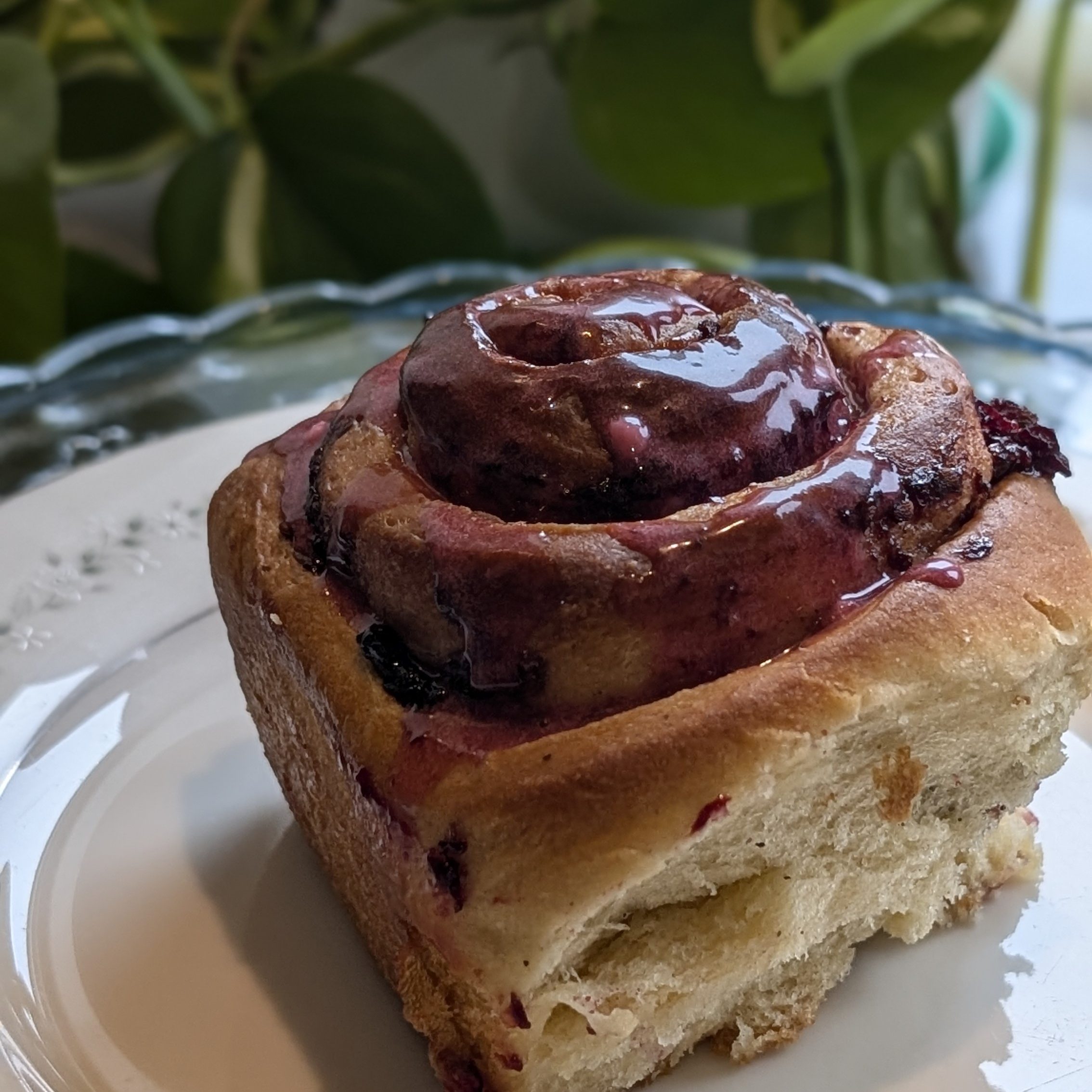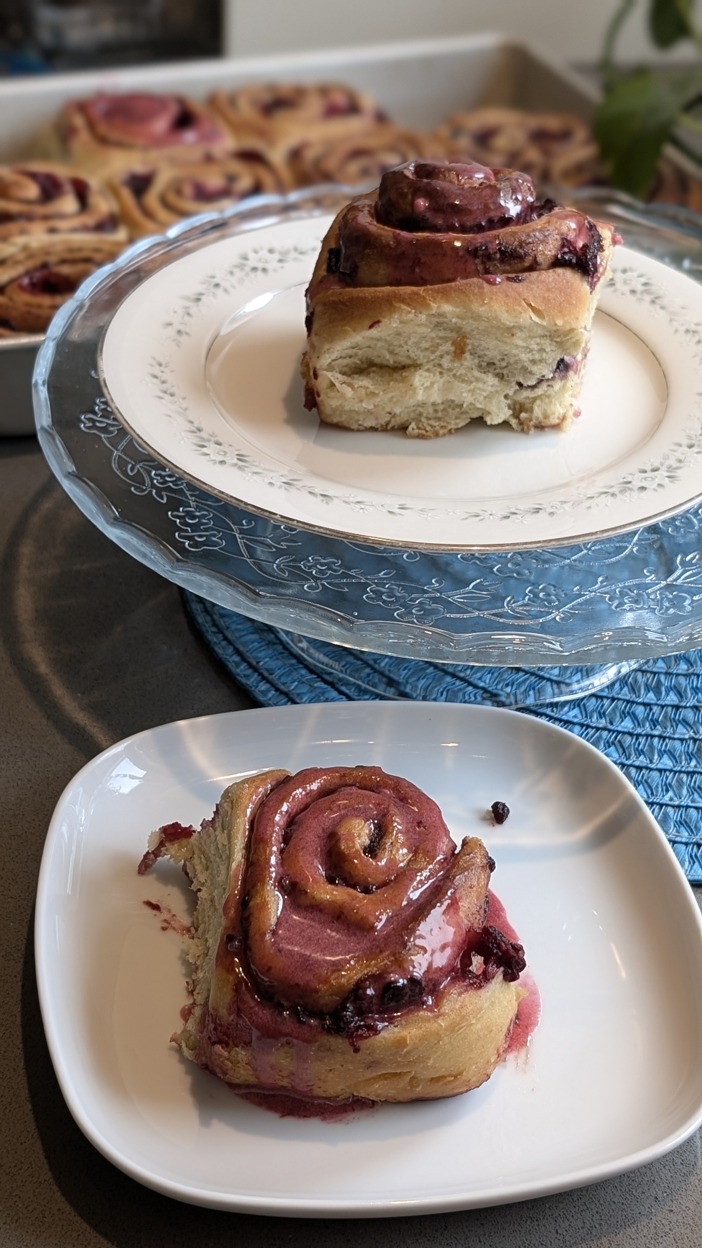 In a 9 by 13-inch baking pan, place the buns cut side down in the pan leaving space between each. Cover with plastic wrap and let rise until doubled around 40 minutes. Preheat the oven to 375 F and bake the buns until golden brown about 15 to 20 minutes. Cool in the pan for at least 15 minutes. Meanwhile, make the glaze. Sift the confectioners’ sugar into a bowl, then whisk in the cream and add Blackberry juice. Spoon the glaze on top while still warm.