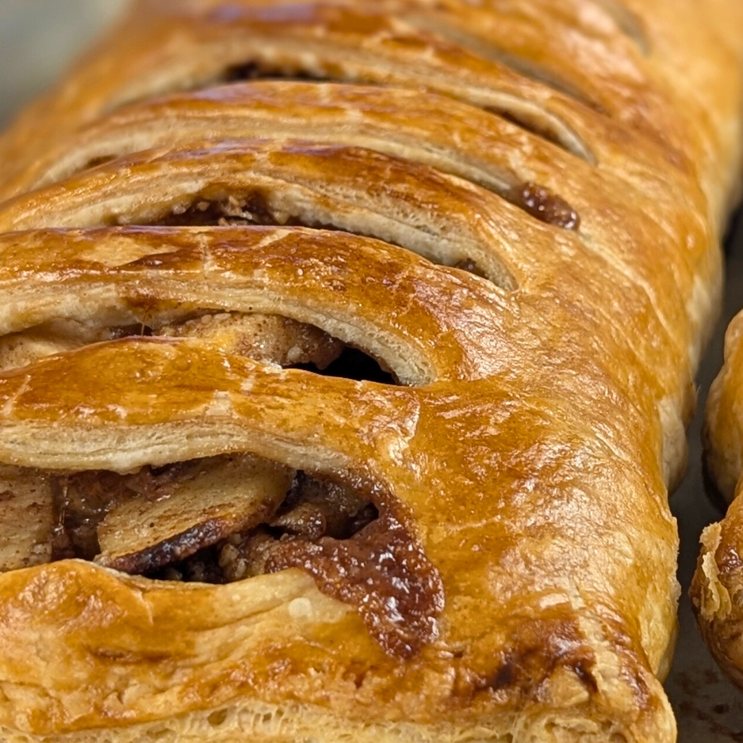 Apple strudel is a delightful treat. It combines the flaky goodness of puff pastry with a classic apple filling, creating a perfect balance of flavours and textures. Each strudel is crafted with care. It features layers of buttery pastry that puff up beautifully in the oven, resulting in a golden-brown exterior that is both crispy and tender. The apple filling is sweet and tangy, infused with warm spices like cinnamon and nutmeg. This mix evokes the comforting essence of a homemade apple pie.