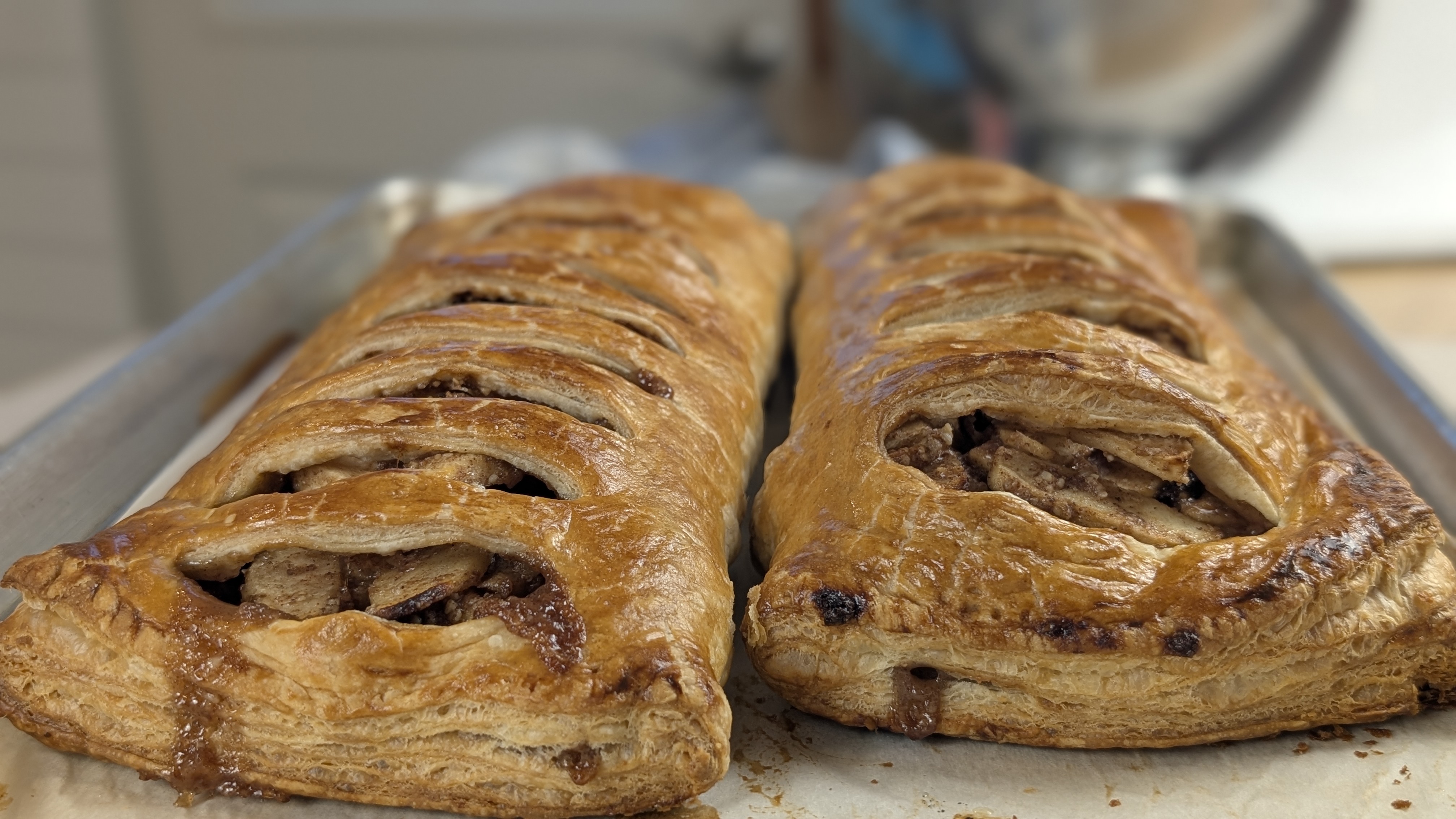 - Brush the strudels with egg wash. Bake the strudel in a preheated 380˚F oven for 40-45 minutes until golden brown. Let the pastry cool for 10 minutes.