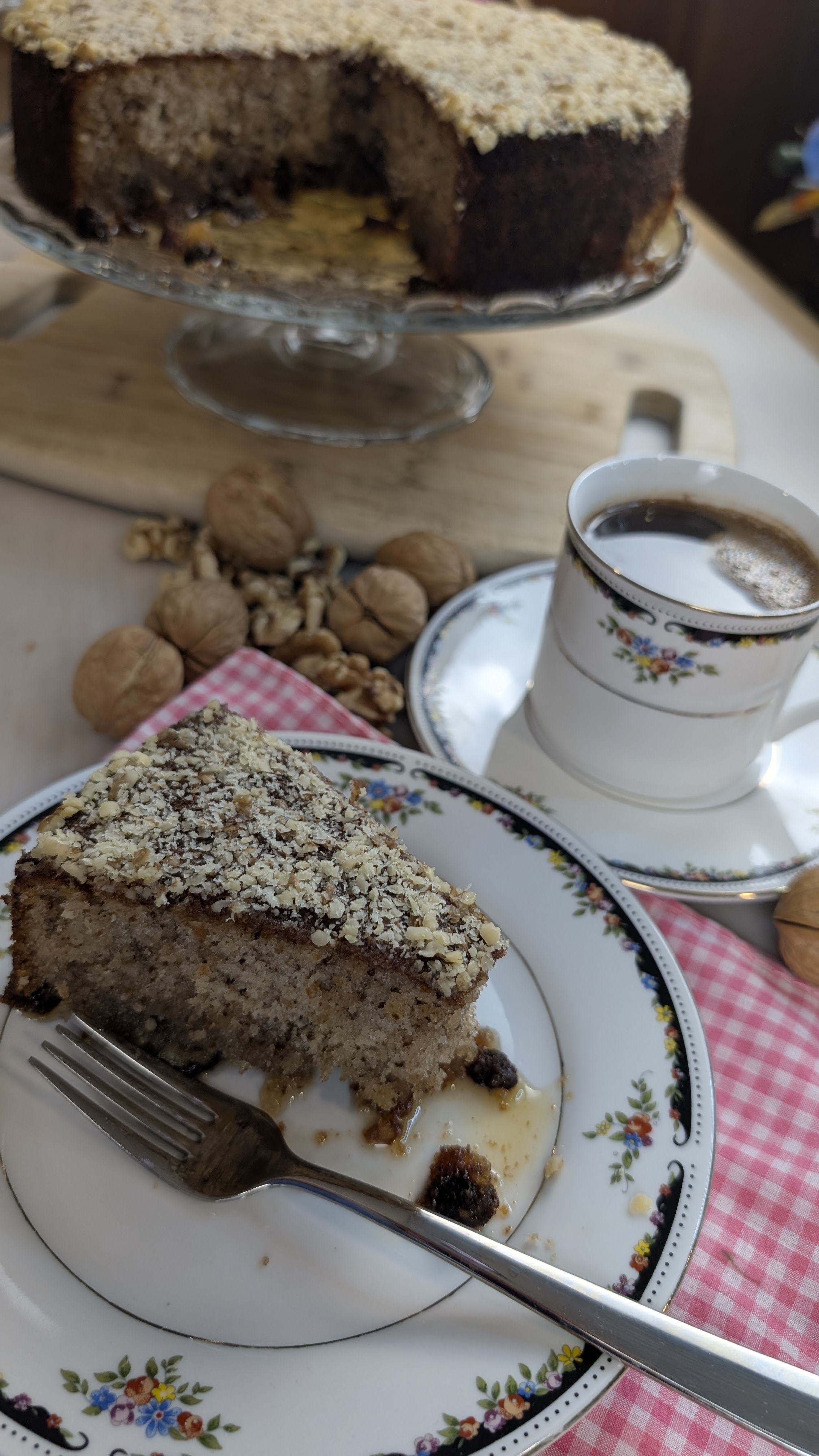 This cake features a rich cake base made from coarsely chopped walnuts, which are expertly blended with a hint of cinnamon, sugar, and eggs creating a nutty and aromatic foundation that pays homage to the classic baklava.