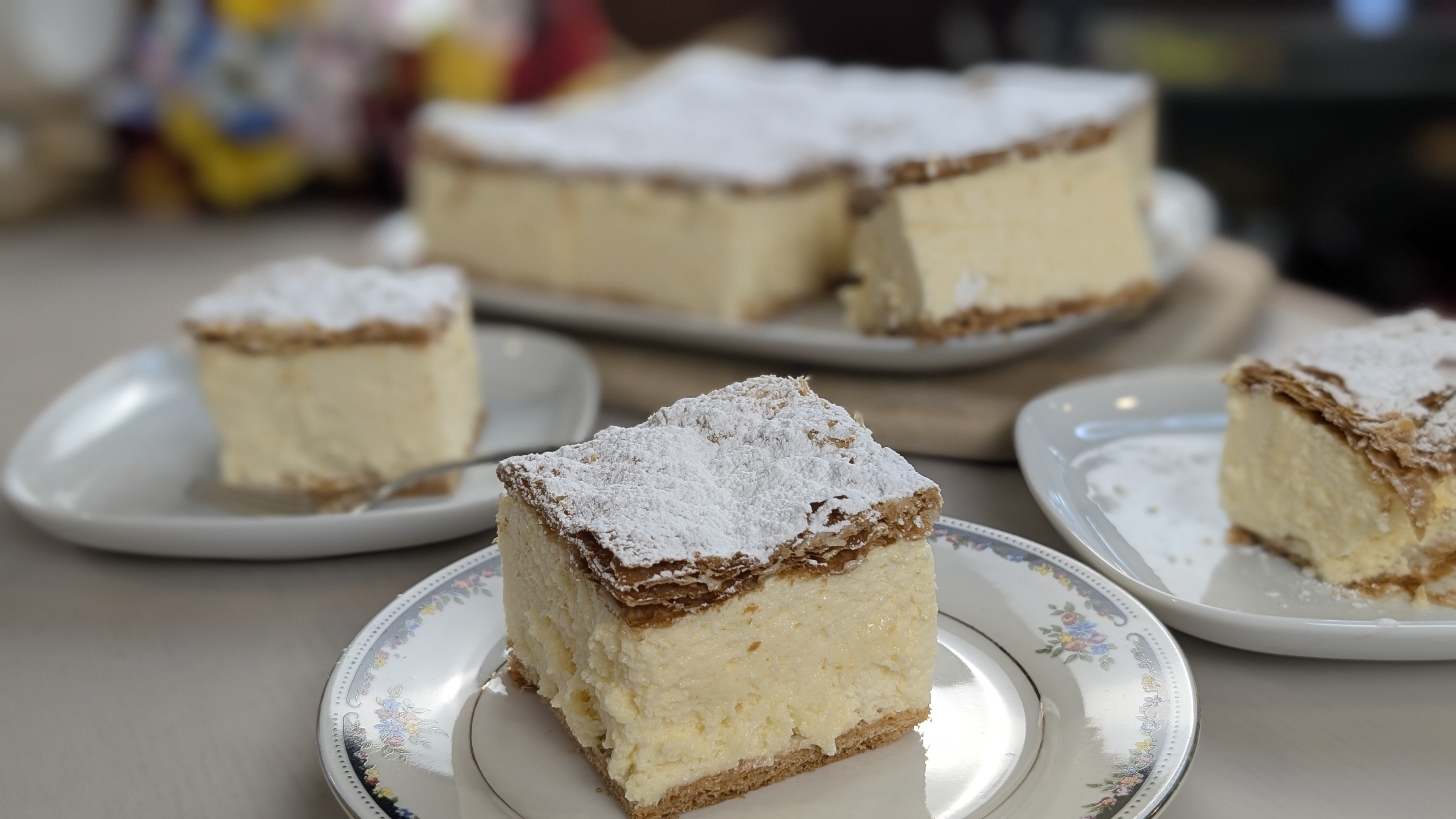 Cremeschnitte is very popular in all of Europe. It is also known as cream slice, cream pie, KREMPITA,vanilla slice, custard slice, krémes, kremówka, napoleonka, cremșnit, cremeș, crempita, kremšnita, krémeš, kremna rezina, and so on. It consists of crisp puff pastry sandwiched around a thick Chiboust cream, which is vanilla pastry cream mixed with Italian meringue.