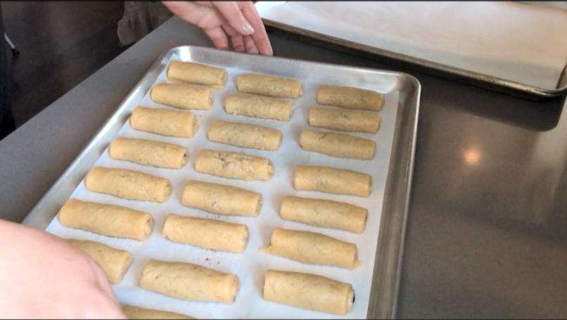 - Roll up each piece but make sure you tuck in the jam. Place it on a pan covered with the parchment paper.