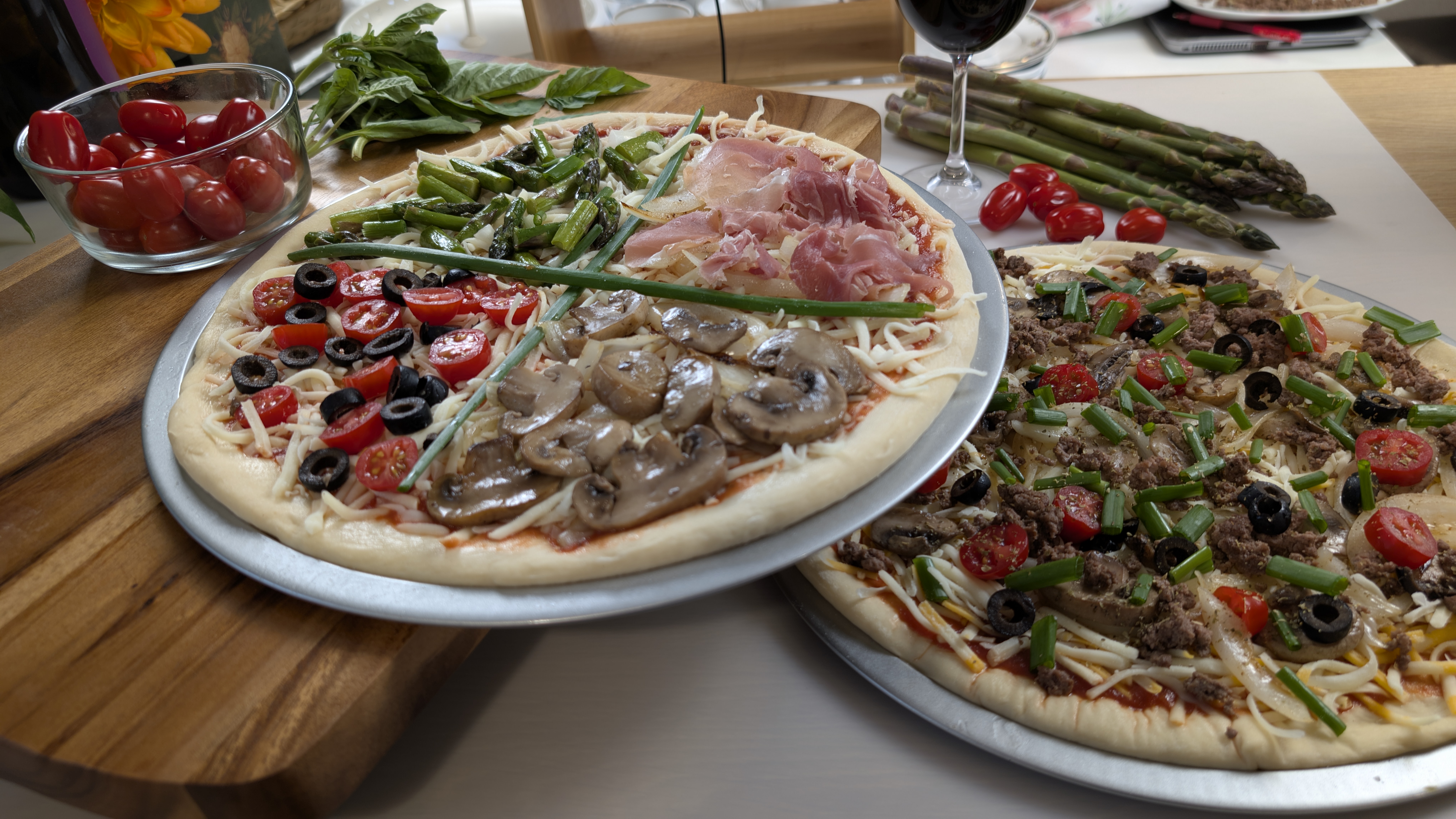 - Add onion and prosciutto to one, onion and mushrooms to another, olives & cherry tomatoes to the third, and asparagus & green onions to the fourth. onions are optional, however, they gave extra flavor to prosciutto.