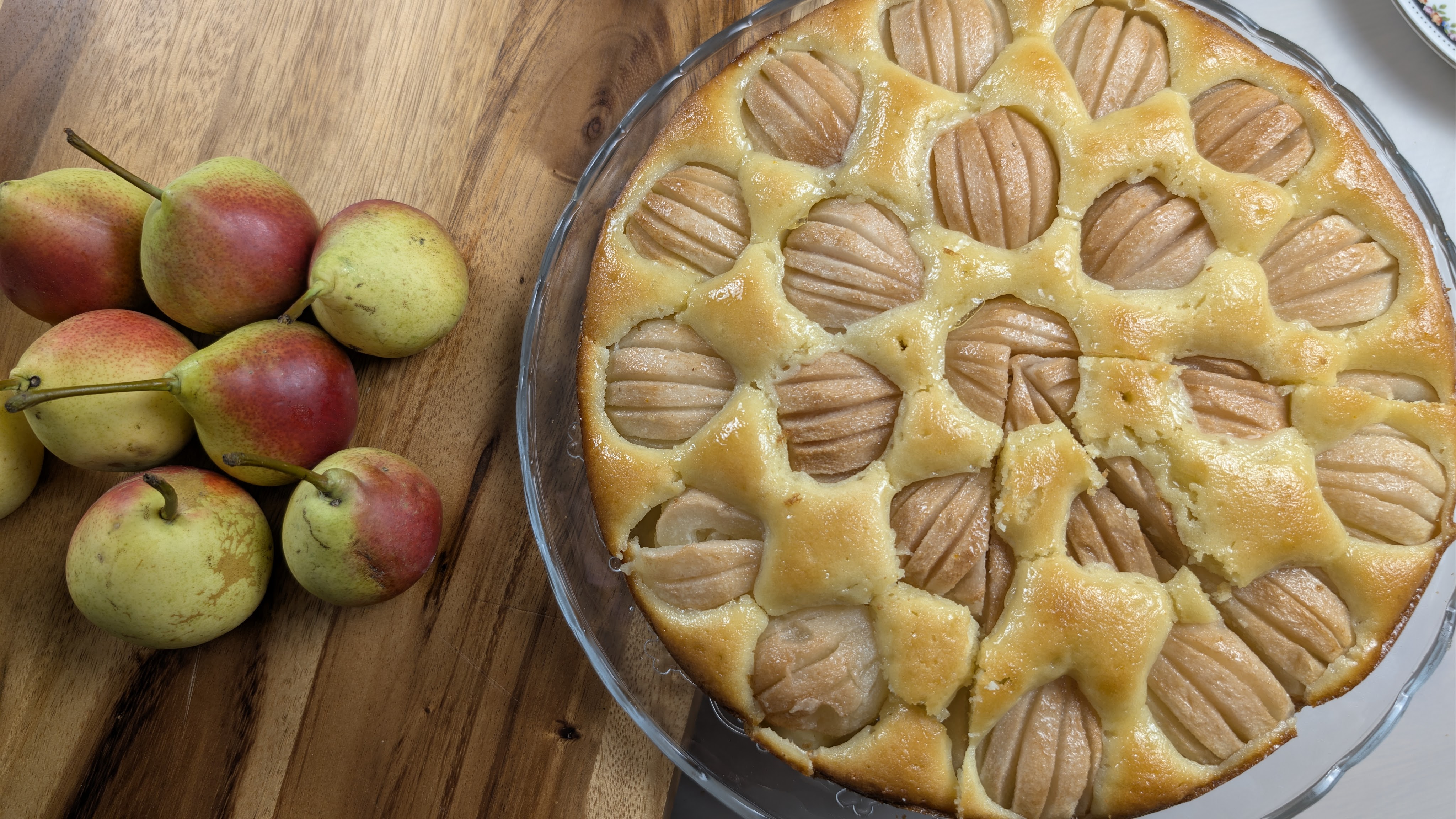 - Wash, peel, halve, and core the pears. Score each half lengthwise and arrange them in a circle on the batter.