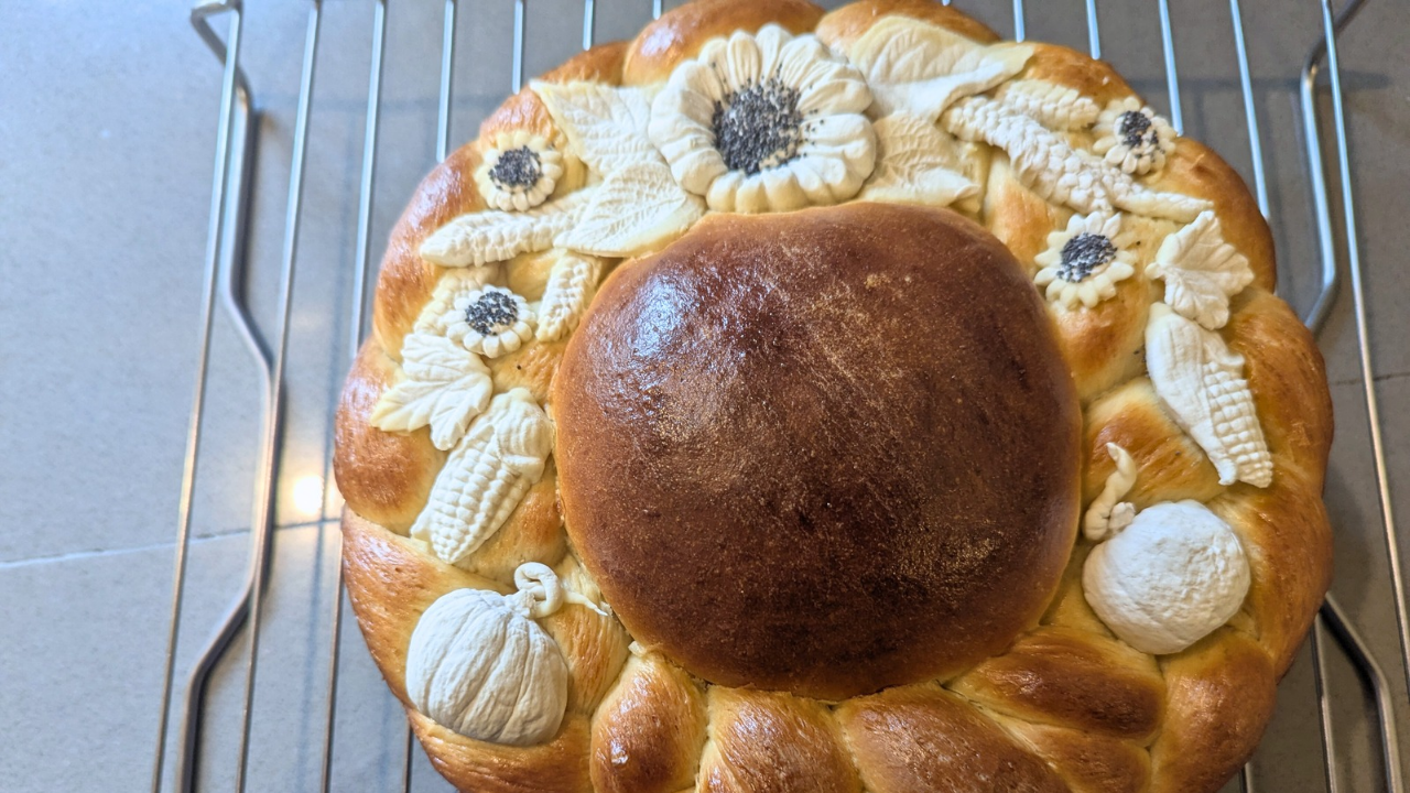 Dead dough is a simple, non-leavened dough that doesn’t rise, making it perfect for creating intricate flowers, leaves, and festive motifs that bake beautifully on top of bread.