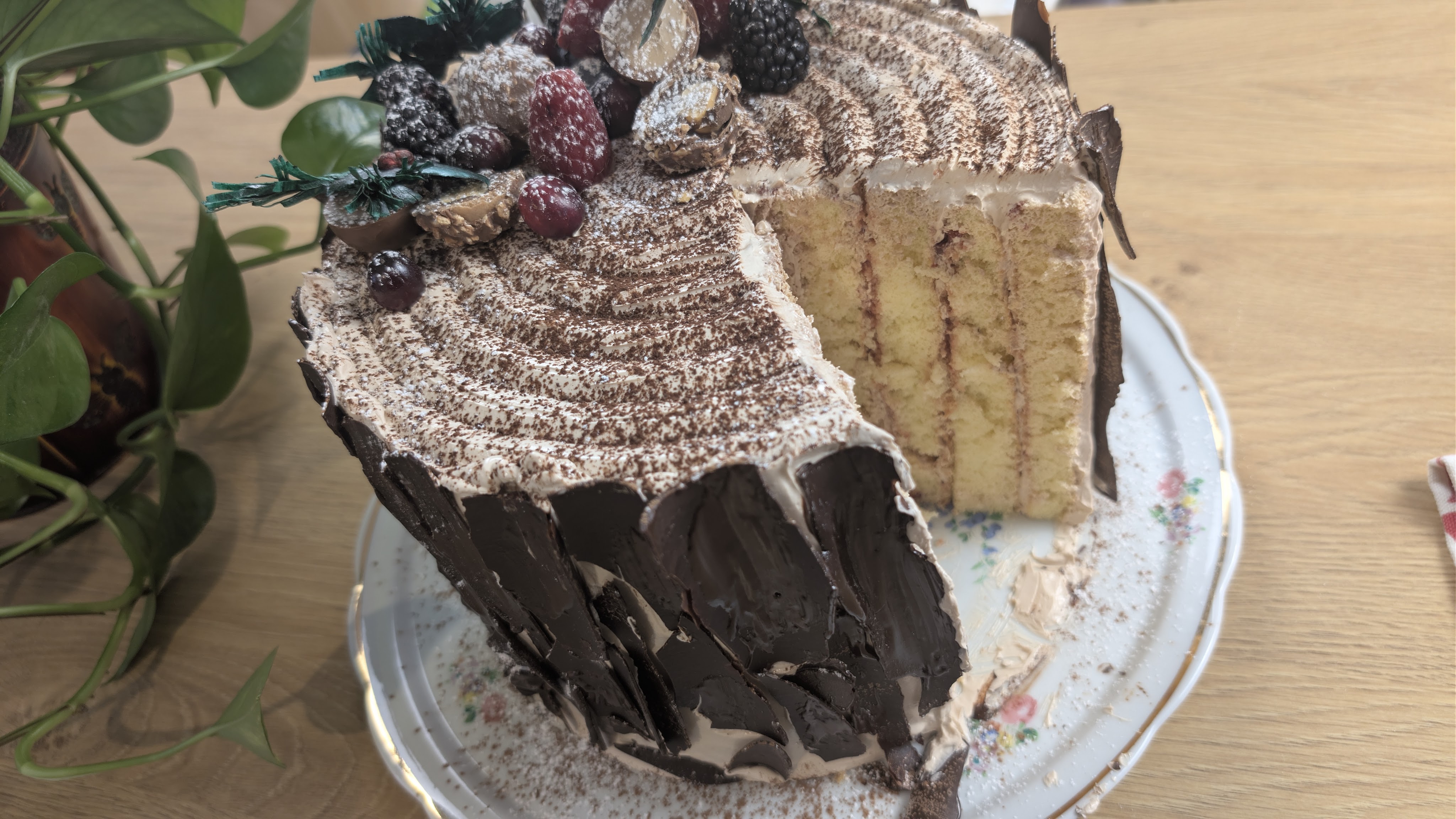 A festive holiday centerpiece with soft sponge, chocolate buttercream, strawberry jam & dramatic chocolate bark
