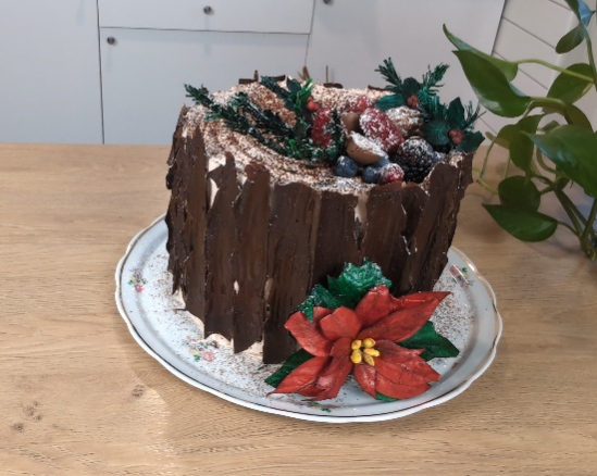 Ova Božićna čokoladna torta u obliku panja pravi je praznični spektakl. Mekani biskvit, čokoladni puter-krem i sloj džema od jagoda savijeni su u visoku tortu, obloženu čokoladnom korom i bogato dekorisanu bobičastim voćem i prazničnim detaljima.