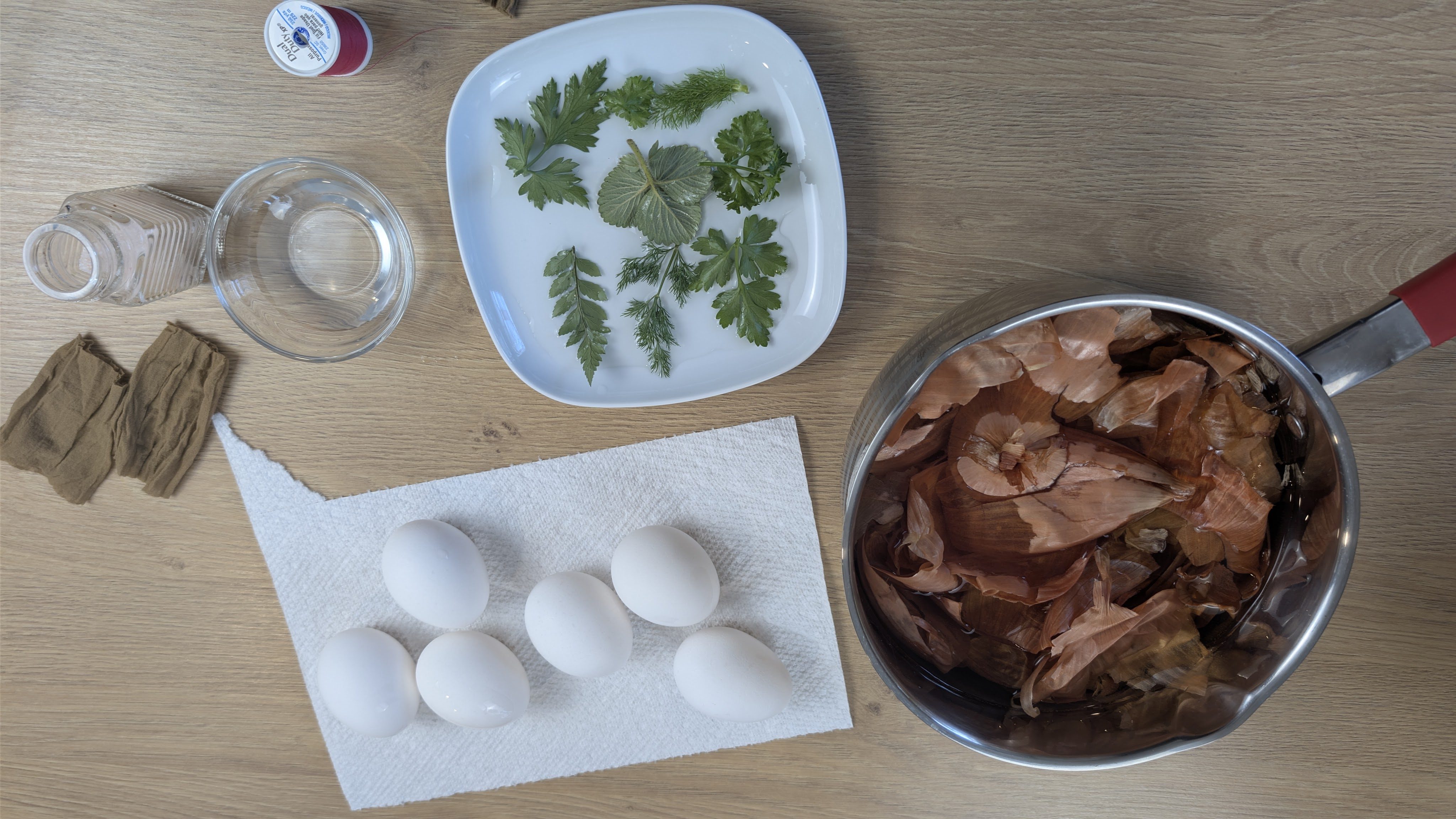 Pokvasiti listiće, prilepiti ih na jaje, staviti u čarapu i vezati.