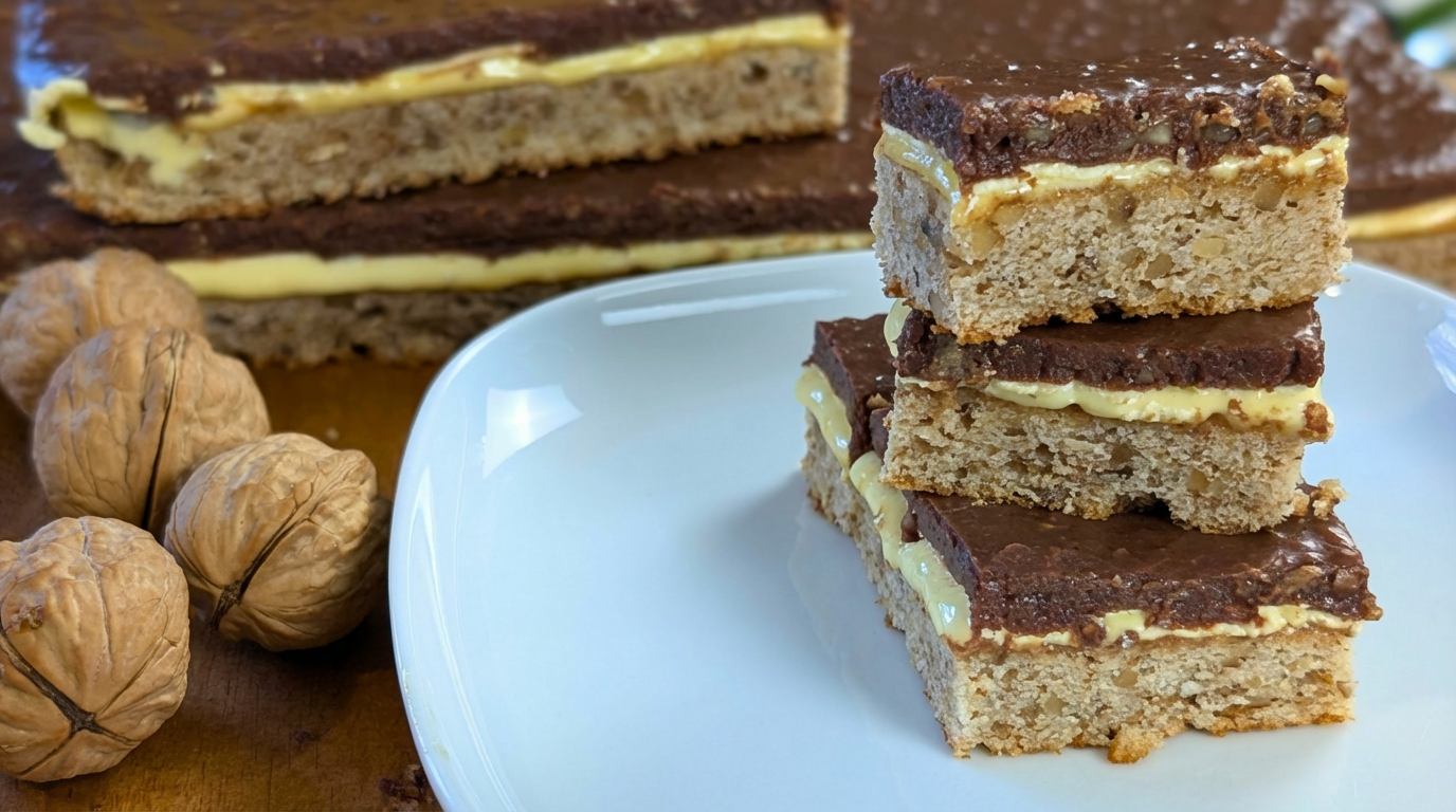 If there is one dessert that truly lives up to its name, it’s this one. Kraljica Štangli, or “Queen of Bars,” is a classic Balkan treat made with walnuts, rich egg layers, and a silky chocolate topping.